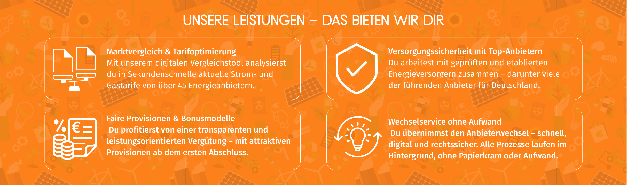 Biete deinen Kunden eine breite Auswahl an Strom- und Gastarifen – vom klassischen Grundversorgungstarif bis hin zu günstigen Online-Angeboten und nachhaltigen Öko-Tarifen.